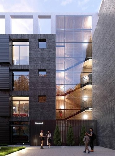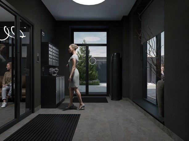 Часть окон смотрит на Воронежское водохранилище и пешеходную дамбу Чернавского моста, другая — на тихий двор с благоустроенной территорией. Стеклянная входная группа, тёплый тамбур, парадные, комфорт-зона с диваном и кулером создают приятную атмосферу. Благодаря витражным окнам лестничные площадки наполнены естественным светом