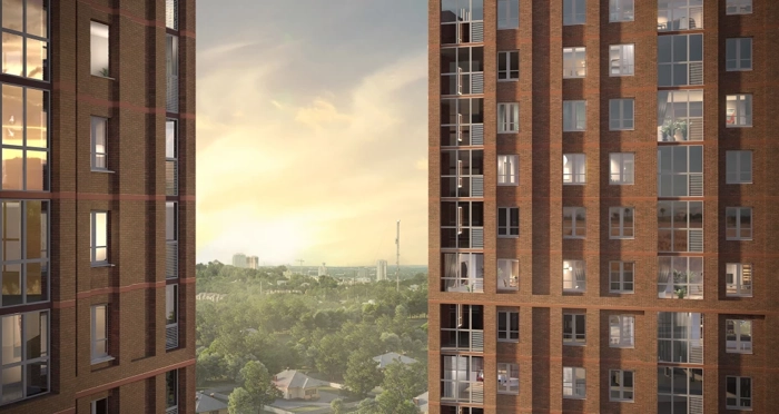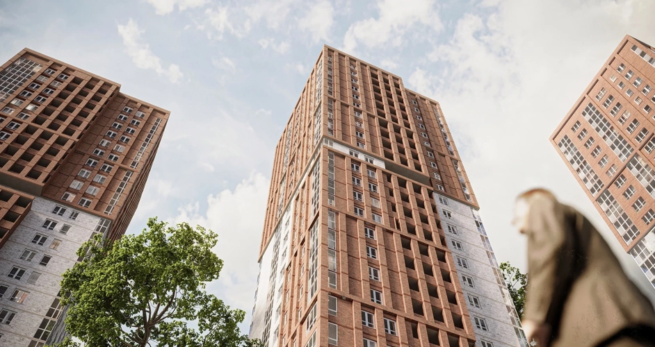 Фасады ЖК «Галилей» исполнены стильной «баварской» кладкой кирпича с чередующимися оттенками. Объёмная кладка подчёркивает вертикальный ритм домов.