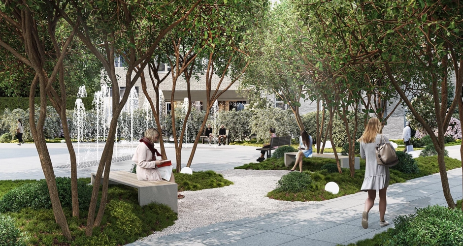 В самом центре ЖК есть «главная площадь» с сухим фонтаном, прогулками у которого смогут насладиться взрослые и дети. Летом фонтан подарит жителям прохладу и свежесть, а зимой на площади будет украшаться живая ель.