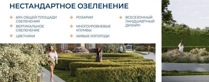 На территории ЖК «Галилей» разбит целый сад с десятками видов растений и различными функциональными зонами: для прогулок, тихого отдыха, активных игр. Подобраны крупномерные и быстрорастущие виды растений с высокими показателями выработки кислорода. По всему участку обустроена ландшафтная подсветка.